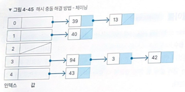 ① 체이닝: 해시 충돌이 발생하면 같은 해시가 나오는 키의 값을 연결 리스트에 저장하는 방식