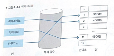 해시 테이블: 하나의 key에 대해 하나의 value을 저장하는 형태의 자료 구조 -> 평균적으로 O(1)의 시간 복잡도를 갖음