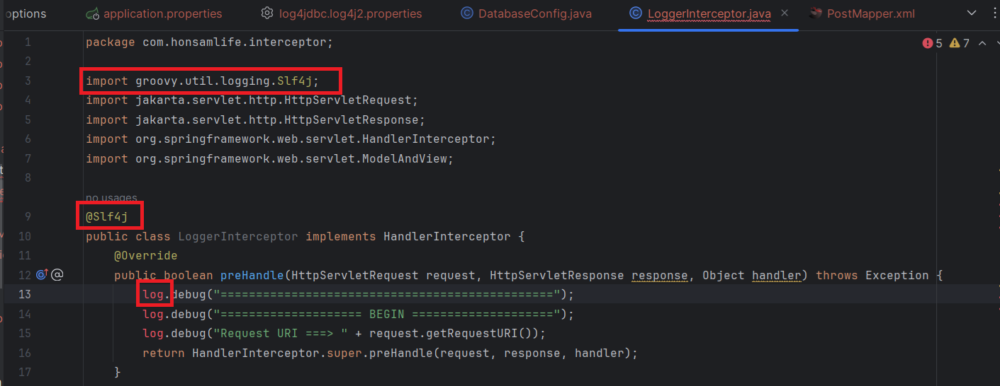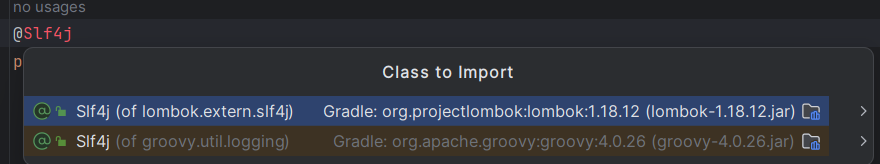 | 항목 | import groovy.util.logging.Slf4j; | import lombok.extern.slf4j.Slf4j; |